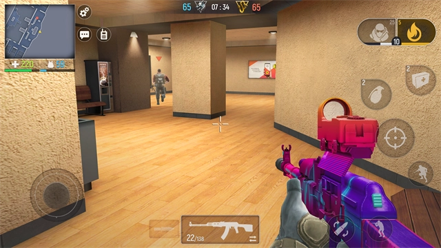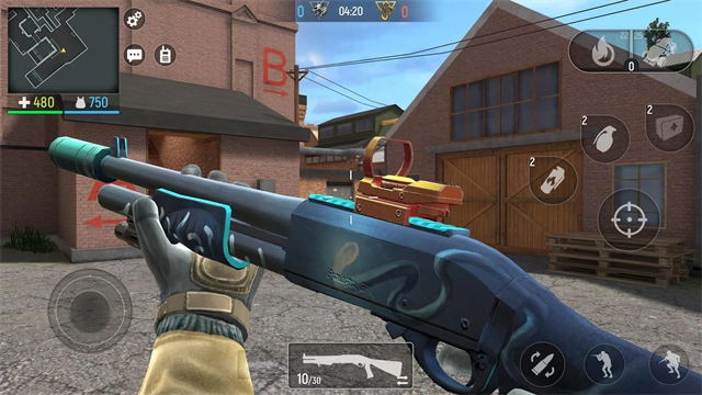 左侧负责遥感操作,右侧进行射击控制,像瞄准、更换弹药、投掷手雷、切换武器这类功能与操作都设计得比较常规,符合大多数玩家的使用习惯。在一局有时间限制的对局里,玩家需要尽量消灭敌对势力来获取积分,角色死亡后能从基地重新复活,还可以和队友配合展开协同作战。