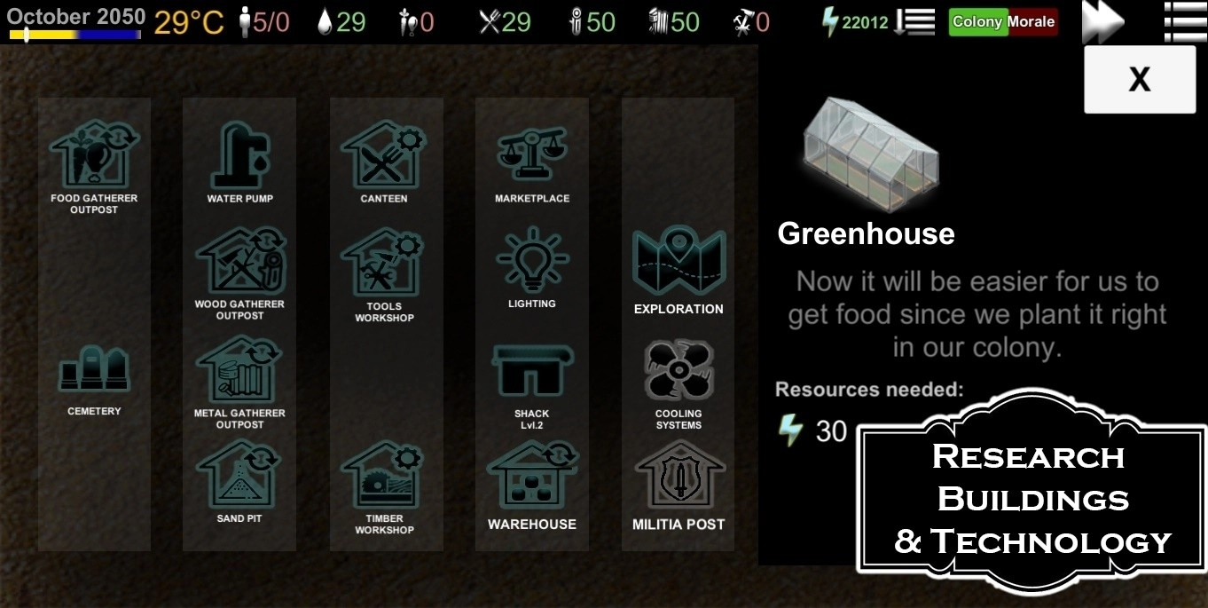 你得借助系统里的研究系统,在挑战中用心打造属于自己的殖民地,并且要把基础设施和各类建筑物都搭建完成。游戏里的玩家确实得保证每个人都能获取到生存与发展所必需的资源。你需要逐步探索周边的地图,同时还要派遣研究小组前往未知的地图执行任务。