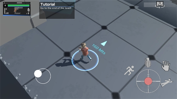 2, 手指在屏幕任意位置滑动,即可操控角色行走;屏幕右下角的按键依次为跑步、翻滚、投掷手雷、指纹开门,而中间的红色按钮则是射击按钮。