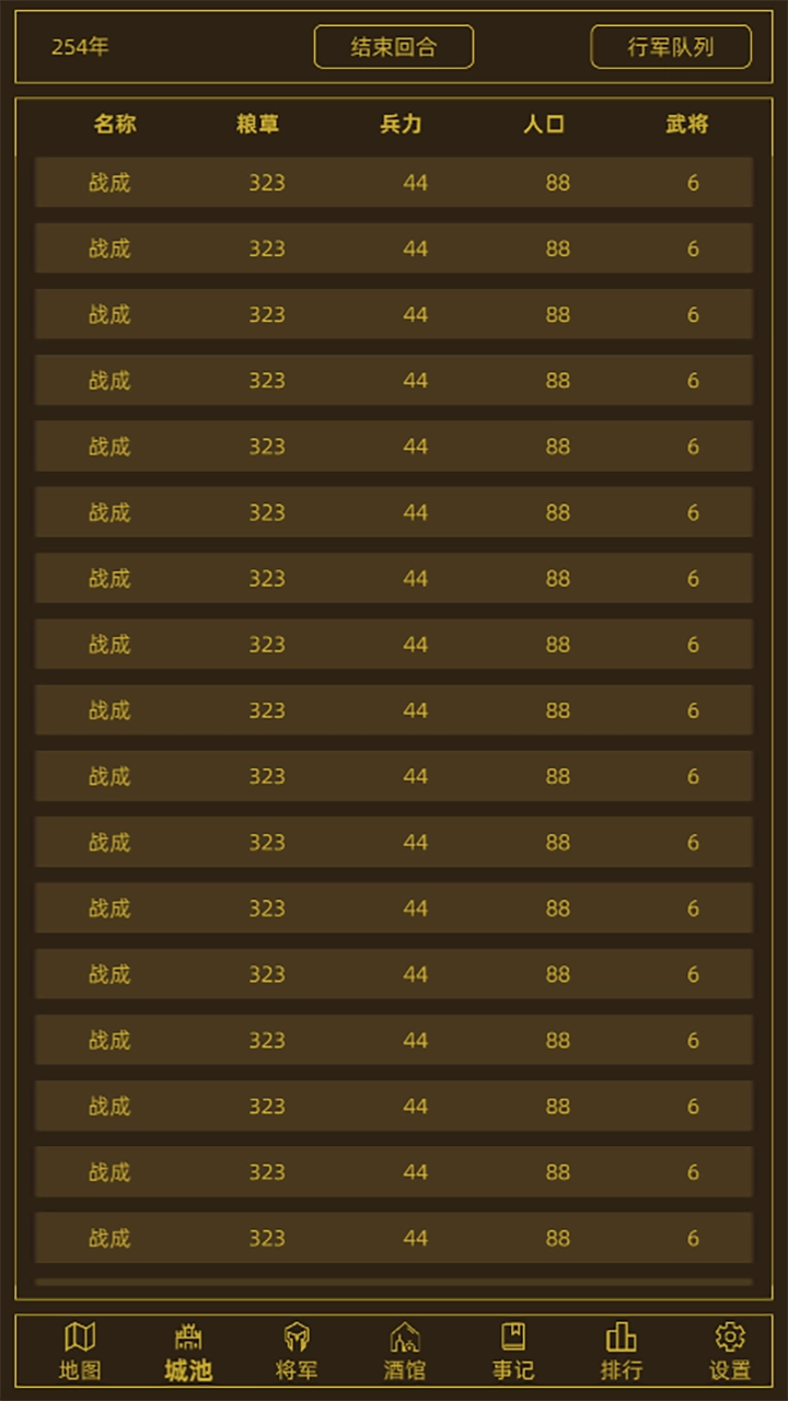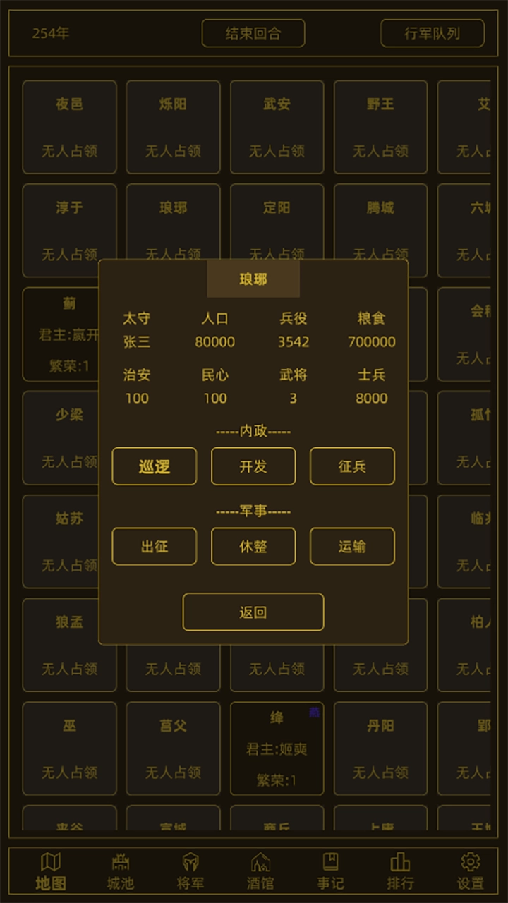 攻占叛乱的城池和无人驻守的空城,持续征兵直到兵力积累到三万且过程顺利没遇到阻碍,这一局的基础算是初步打牢了,局势也稳定下来了。要是情况不对,那就重新开始吧……