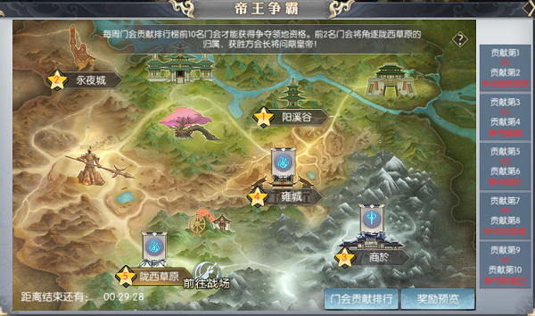 系统依据门会周贡献榜前10名的贡献值,来划分帝王争霸的参与资格。其中,排行榜前2名的门会将争夺五星领地陇西草原;第3、4名的门会角逐四星领地雍城;第5、6名的门会竞争三星领地商於;第7、8名的门会争夺二星领地永夜城;最后2名的门会则争夺阳溪谷。 领地的星级越高,对应的奖励就越丰厚,门会成员能获得的收益也随之提升。值得一提的是,五星领地陇西草原同时也是帝王战场,该领地的获胜方会长将成功问鼎皇帝之位。