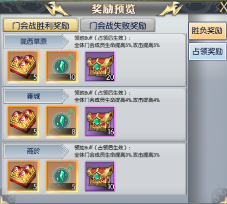 占领领地的门会全体成员,每日都能领取一份奖励,该奖励可一直领取至下次门会战开启(每天均可领取一次)。另外,在占领领地期间,门会成员还能获得领地buff,其生命与攻击属性会得到一定比例的提升,并且领地的星级越高,对应的属性加成比例也会越高。