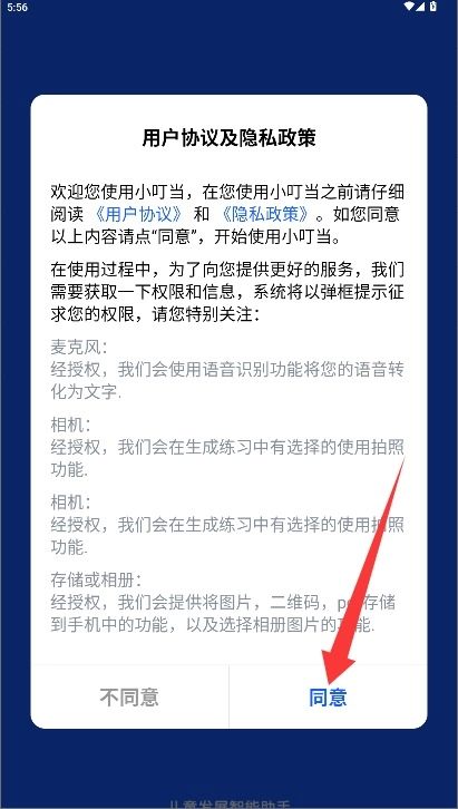 首次使用时,请仔细阅读平台的服务条款和隐私政策,在确认无误后,点击同意选项即可进入登录界面。
