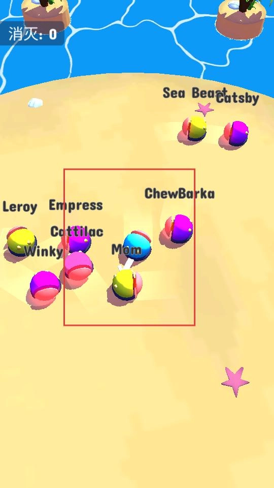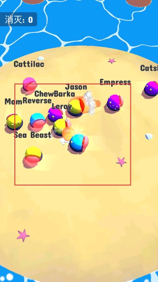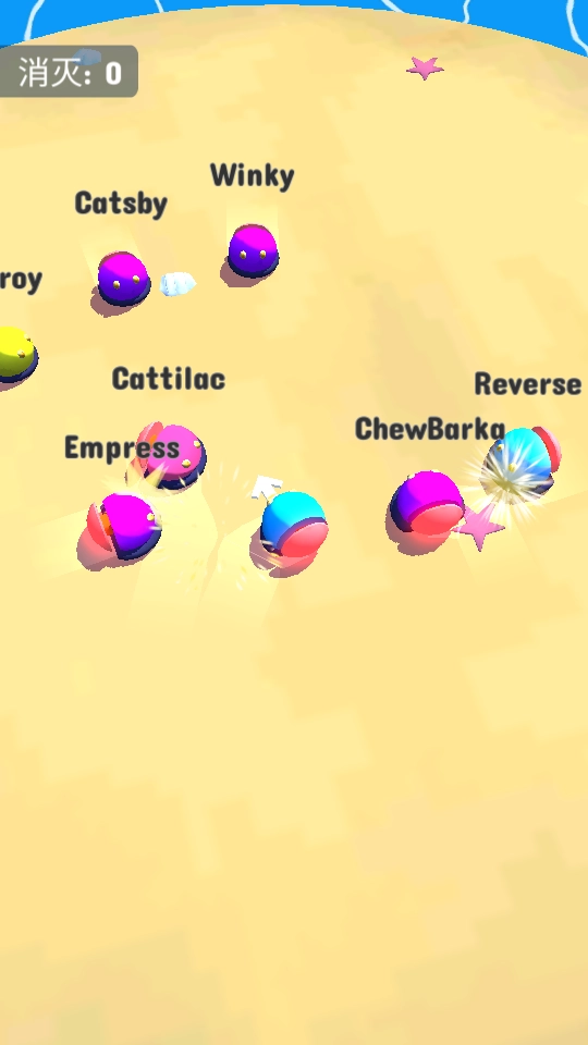 你需要操控一个彩色球体角色,在沙滩场景中移动,和其他有名字的球体发生碰撞,把它们撞出这片区域,与此同时还要躲避敌方球体的撞击。