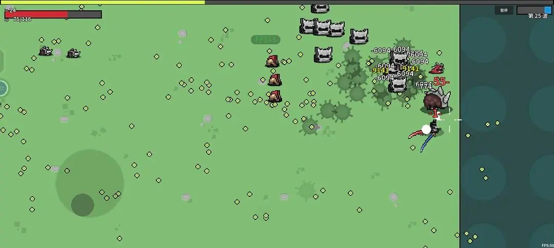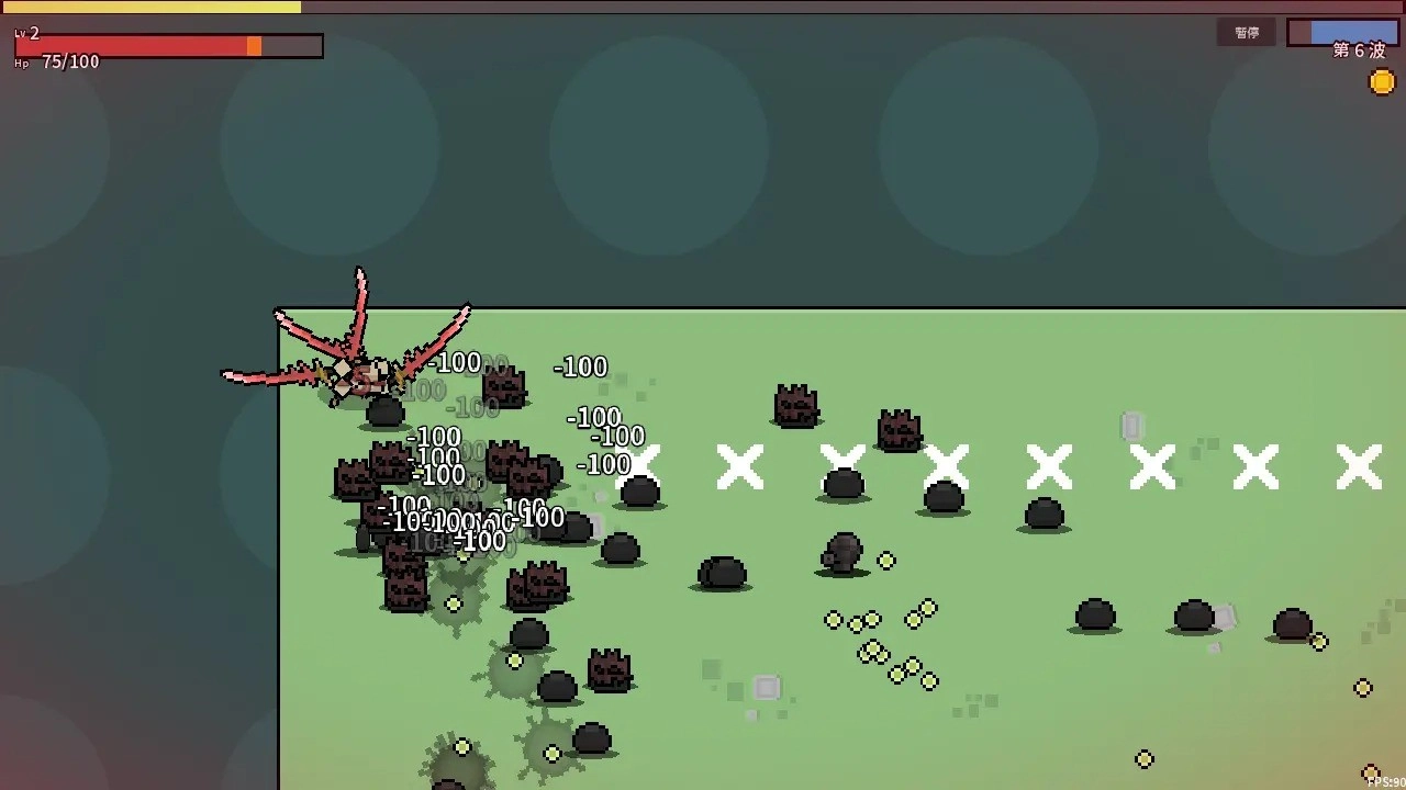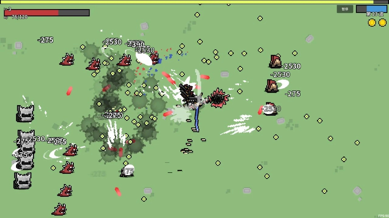 本游戏的数值设计带着种“用脚填数”的随性,敌人的触碰伤害、刷新速度和数量总能打你个措手不及,稍不留意就会直接GG。尤其是到了15到20关往后,敌人伤害会大幅飙升,再配上超高的刷怪频率,玩家很容易被堵在角落围殴致死。