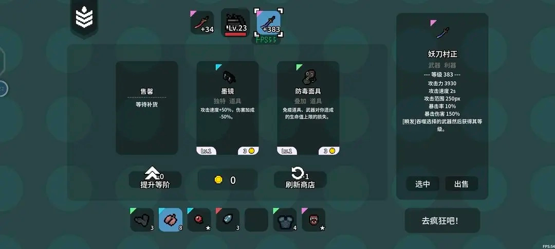 2、然后我们继续升级商店,直至升到顶级,这时我们主武器的等级就来到了惊人的320级,然后我们在商店持续刷新,直至刷出妖刀村正通过吞噬,继承人武器的等级,攻击立即来到了惊人的3000+,这个时候就差不多等于成砍瓜切菜了。然后大家再继续把保命的装备以及伤害加成的装备拉起来,就可以比较轻松的通关了(当然,因为游戏数据跟拿jio填的一样,并不会那么容易,只能说通关的概率更大了)