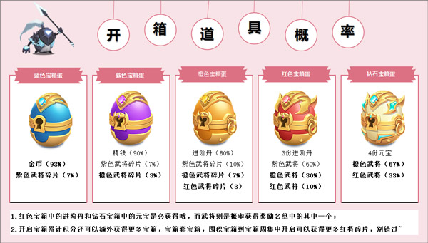 首先要提到的就是宝箱蛋啦,宝箱蛋一共有五个品质,分别是蓝色、紫色、橙色、红色和钻石蛋。开启宝箱蛋不仅能得到武将碎片,还能获取各类用于升级武将和玩家角色的资源,具体的内容大家可以参照上面的表格。不管是推进关卡、击杀每周BOSS,还是击败入侵的圣兽等,都有机会获得道具蛋。开蛋的奖励十分丰厚,要是赶上活动周,还能拿到更多额外资源,各位小伙伴可千万别错过哦~