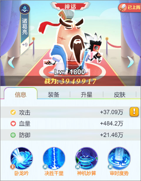 丞相堪称最全能的输出核心,不仅拥有范围伤害(AOE),还能对敌方输出核心造成额外伤害,绝对是推图爬塔的首选。不过由于技能存在随机性,稳定性方面确实有待提升,需要搭配一位能给敌方施加减益效果(debuff)的英雄。各位蛋友要是抽到的碎片数量充足,可以考虑搭配芈月或周瑜,组建一套兼具控制与范围伤害的阵容。
