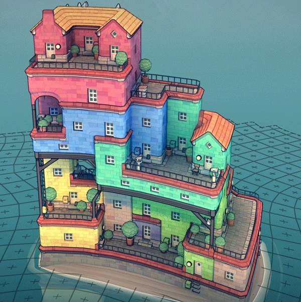 ②要保证房屋的颜色各不相同。要是采用一样的颜色,缺口上方那栋房子的底部就会有脚手架显现出来。