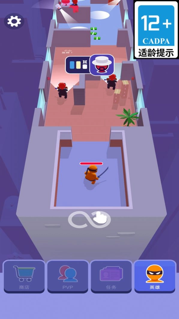 你需要操控橙色角色进行移动,借助左下角的虚拟摇杆靠近红箭头指向的黑衣敌人,同时要注意避开敌人光线覆盖的视野区域。