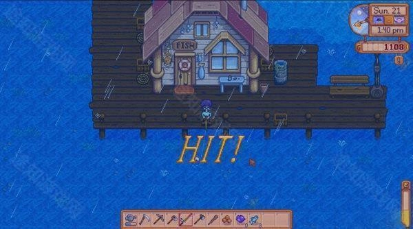 一直等到听到特殊声音的时候,可以看到头上有个“!”标志。然后水边出现hit标志。然后你就可以收杆了。