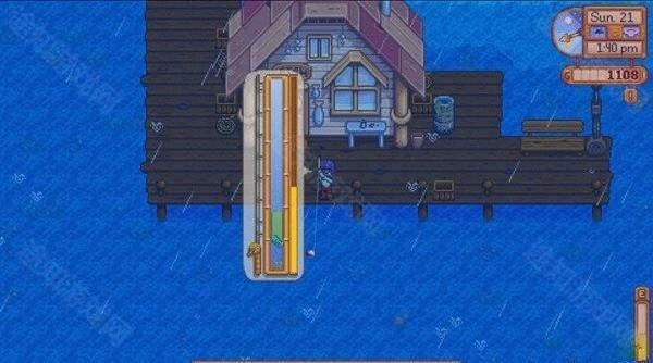 接下来是难点,出现钓鱼界面,鼠标按住那个绿色的格子,按住时间越长,那个绿格上升越快,多试几次,把握好按的时长。