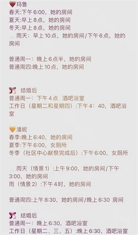 4、莉娅和艾利欧特的亲密时光在冬周五3:30pm开始,他们会在男厕享受彼此的陪伴。而阿比盖尔和赛巴斯的浪漫夜晚则在春周五5:30pm在酒吧男厕上演。