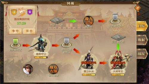 4、下水道里的“密探”和太庙入口的“国王雕像”两个NPC,分别占领“密探”和“国王雕像”的一方将分别获得防御和攻击的加成。因为禁卫队长的存活可以为大将军王提供强大的减伤效果,所以进攻方可以在占领城管所、密探和斥候后先进攻禁卫队长。击杀禁卫队长后进攻大将军王,进攻方在国战时间内击杀大将军王取得国战胜利。
