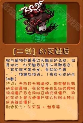 十、【幻灭魅帝】:无敌且无限啃咬,拥有魅帝菇的全部属性,召唤僵尸时会恢复所有被魅惑僵尸的血量,如果血量已满则在魅惑僵尸脚下生成幻灭菇。