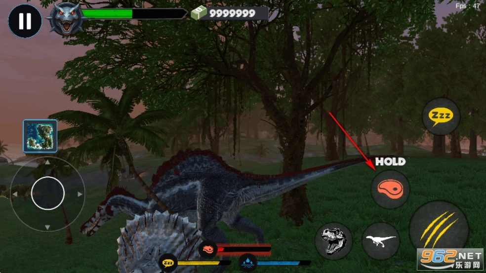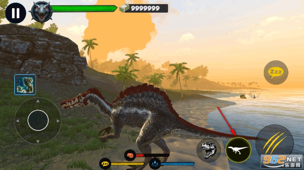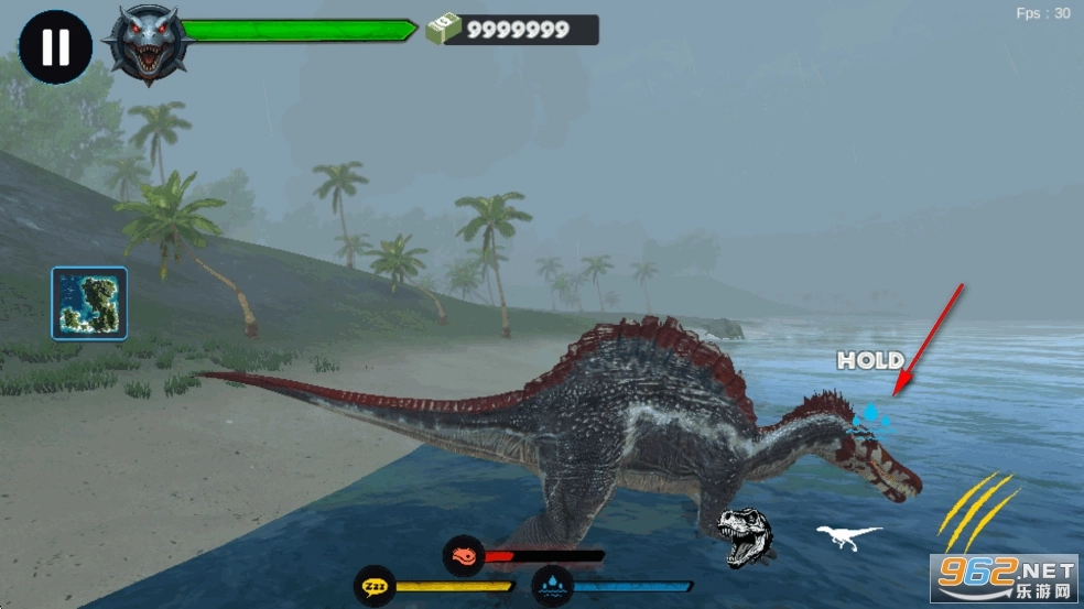 化身为无齿翼龙、风神翼龙等致命飞行爬行动物,在天际间自由翱翔,对霸王龙、三角龙等巨型陆地恐龙发动猛烈突袭。此刻,天空已不再是宁静的乐土,陆地更是沦为战火弥漫的厮杀之地!点击如图按钮,点击一下是喝一口水,长按是一直喝水