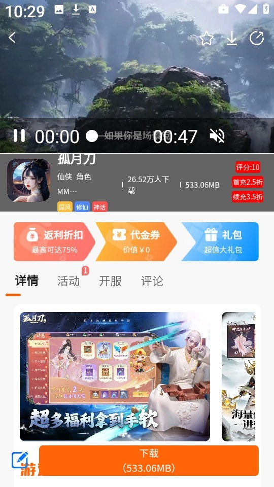 2、首页包含了折扣游戏,视频专区,礼包中心,以及活动公告等版块。