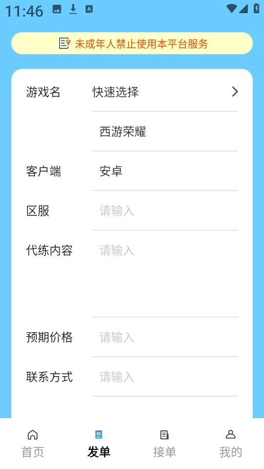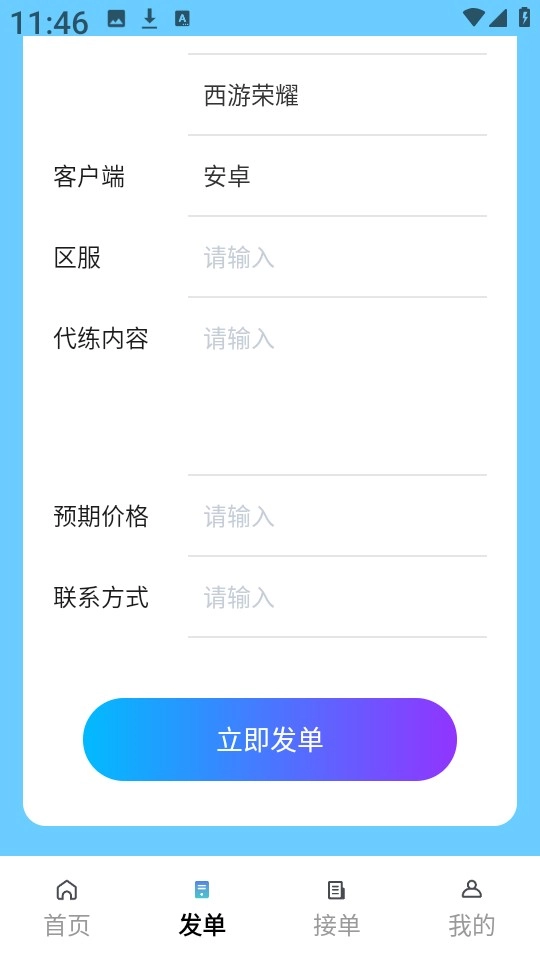 4、然后自定义输入区服,代练内容,预期价格等,就可以直接点击“立即发单”了。