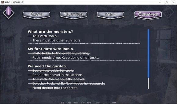 QUESTLOG(任务日志)页面用于查看任务日志。每一个任务有很多子步骤,带删除线的是已完成的子步骤。
