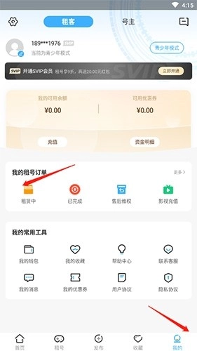 1、打开软件,点击底端的“我的”,点击“租赁中”选项