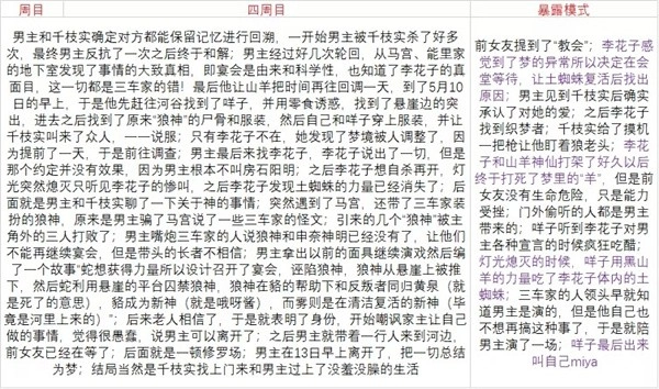 零人势力(暗黑结局)5月20日当天,阳明直接宣称了自己是狼,并得到咩子的拥护。李花子放弃了反抗,独自离开了。近望说其实他和泰长早就知道那所谓的“神”是春假扮的,这一直以来都是他们三个人共有的秘密,那副装扮也曾是他们三人一同设计的。所谓“貉神”只不过是春自己的想象而已。这时,阳明从怀中抽出了千枝实自杀时使用的霰弹枪指着近望——那天晚上正是春将枪藏了起来,并在跳崖前告诉了阳明——打碎了他的头颅。之后,只要阳明杀死李花子和咩子,狼阵营就胜利了。在这里的三位神明中除了申奈明神,还有貉神和一位敌对神——阳明猜测那是以人类为宿主的神。因此,只要能真正杀死李花子和咩子,也许他就能逃脱这无限的生死轮回。但他还是对杀死咩子非常抵触,不愿跨过自己内心的最后一条底线。然而,咩子却突然被貉神附身了。祂宣称着自己无上的力量,并诱惑着阳明加入祂的势力,即可在这方圆十公里的范围内行使阳明能想到的一切的权利。身后咩子惊恐的呼喊声让阳明摆脱了脑中的幻听。(神明路线)他发现雾不知什么时候散了,而四周的一切突然都变得漆黑一片,太阳像发生日全食一般变成了光环。他们头顶一直延伸至远处的山边,一只不可名状的超巨型怪异生物正在向着太阳的方向前进。如深渊般无底的恐惧控制了阳明和咩子,他们只能拥抱在一起瑟瑟发抖——但突然,世界失去了真实感,恐怖也不复存在,一只羊型的布偶出现在了阳明面前。阳明忽然意识到,这正是他每次死亡回溯前的感觉。绵羊布偶说这附近的一部分现实已经被梦境吞噬了,而它是为了解决这一危机才隐藏行踪潜入了这梦境。虽然它不能直接对梦境进行干涉,甚至连梦境中发生了什么也不知道,但它可以帮助阳明在轮回中保留记忆。然而这一次轮回失败了,回溯现象不仅没有发生,阳明也没能查出事件的根源,甚至还出现了无比巨大的怪物。绵羊认为这是阳明保留记忆后的不断试错让梦境的发展产生了异常。所以它此次现身,就是准备用自己的力量强行再次开启回溯。但这次介入必定会被创建梦境的梦魂使发现,因此接下来阳明只有一次机会。在这最后的回溯中,阳明必须避免梦境再次发展至这样绝望的结局,同时查明真相,找出创造出这个梦境的幕后黑手。