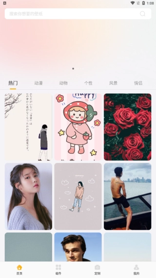 2、首页推送的壁纸类型很丰富,支持快捷搜索,支持热门、动漫以及动物和个性壁纸