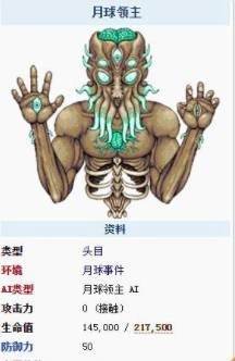 1、月球领主。【泰拉瑞亚1.2】中,在月球事件出现,当玩家摧毁了最后一个天界柱(Celestial Towers)后出现,或是使用物品天界符(Celestial Sigil)来召唤。全游戏最强的BOSS生物。