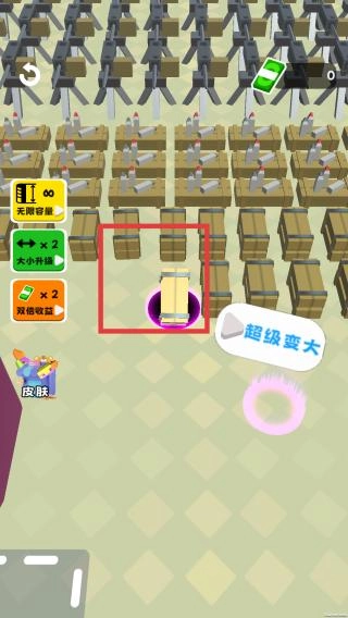 玩家操控物体收集箱子之类的道具,过程中会触发超级变大等特效,同时设有能提升容量、尺寸与收益的功能按钮,整体玩法大概率是通过持续收集道具来实现自身强化或完成相关任务。