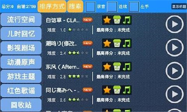 游戏包含五个不同的模式,具体为:新手模式、游戏模式、自由模式、钢琴键盘模式以及欣赏模式。