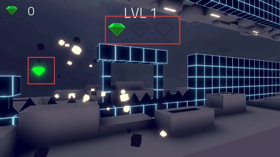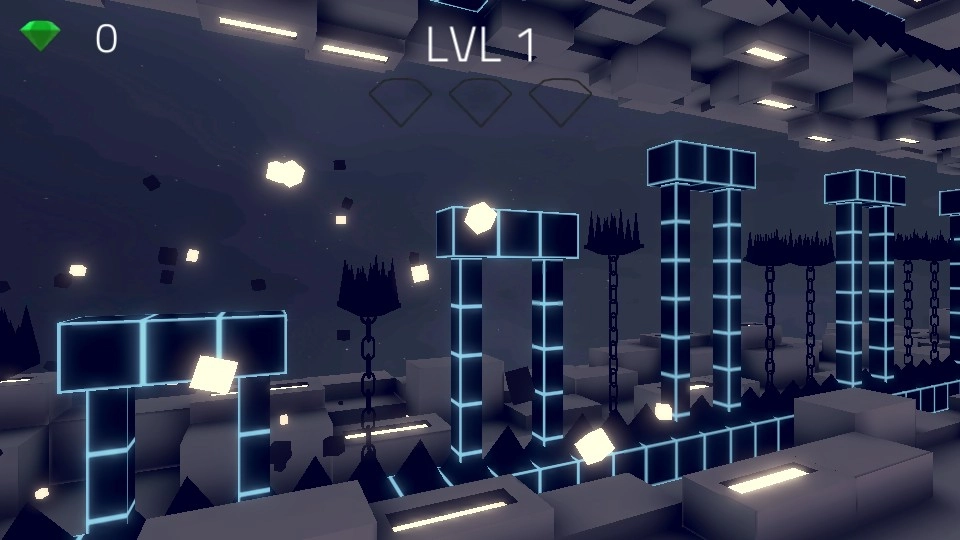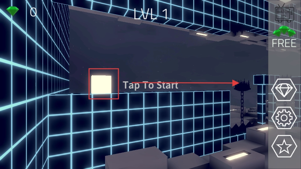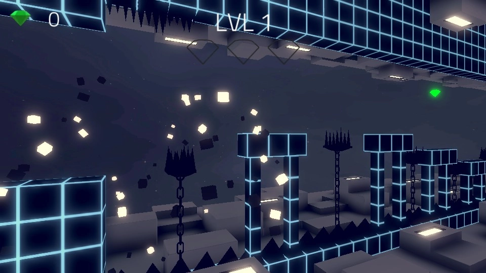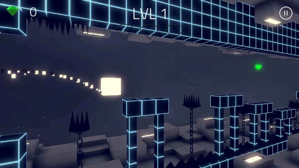 点击开始按钮启动游戏,操控白色方块在场景中移动,收集绿色钻石,巧妙避开黑色尖刺障碍。