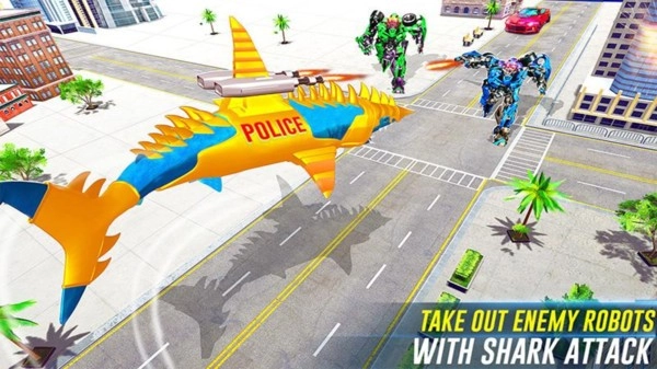 机器人鲨鱼袭击手机版 这是一款以机器人攻击战斗为主题的手机游戏,玩家能够变身为鲨鱼的多种形态,在城市里执行救援任务。游戏中会出现大量外星人入侵,玩法乐趣十足,你还在犹豫什么?感兴趣的话就赶紧来体验吧。
