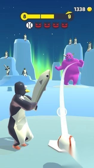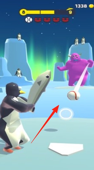 在游戏中,你将操控蓝色企鹅角色进行击球操作。它会用鱼形球棒徒手击球,需要瞄准怪物投来的棒球,点击屏幕即可完成击球动作。游戏场景包含极地元素,如企鹅、极光,还有赛场场景,能看到观众等元素。