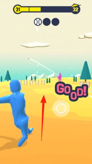 得分判定为球成功飞过怪物时,会显示“GOOD!”,累计得分可推进关卡,此时场景将切换为草地,玩家需持续挑战更远的击球距离与难度更高的怪物。