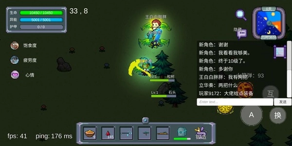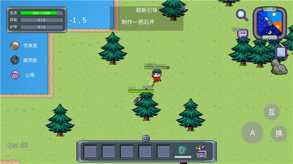 开局直接着手收集木头和石头,接着去科技树解锁关键物品:能回200点血的银杏药丸、作为前期主要输出工具的石剑、用于砍树与挖坑的石斧,还有后续打造武器会用到的铁块。