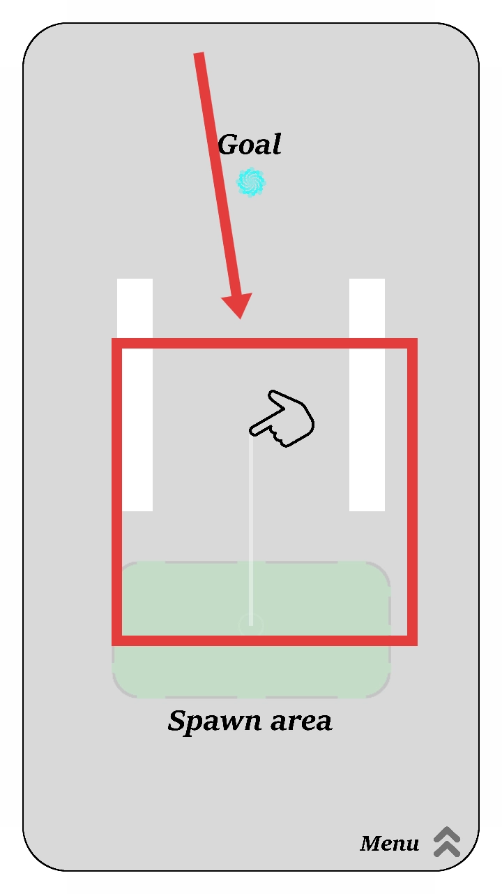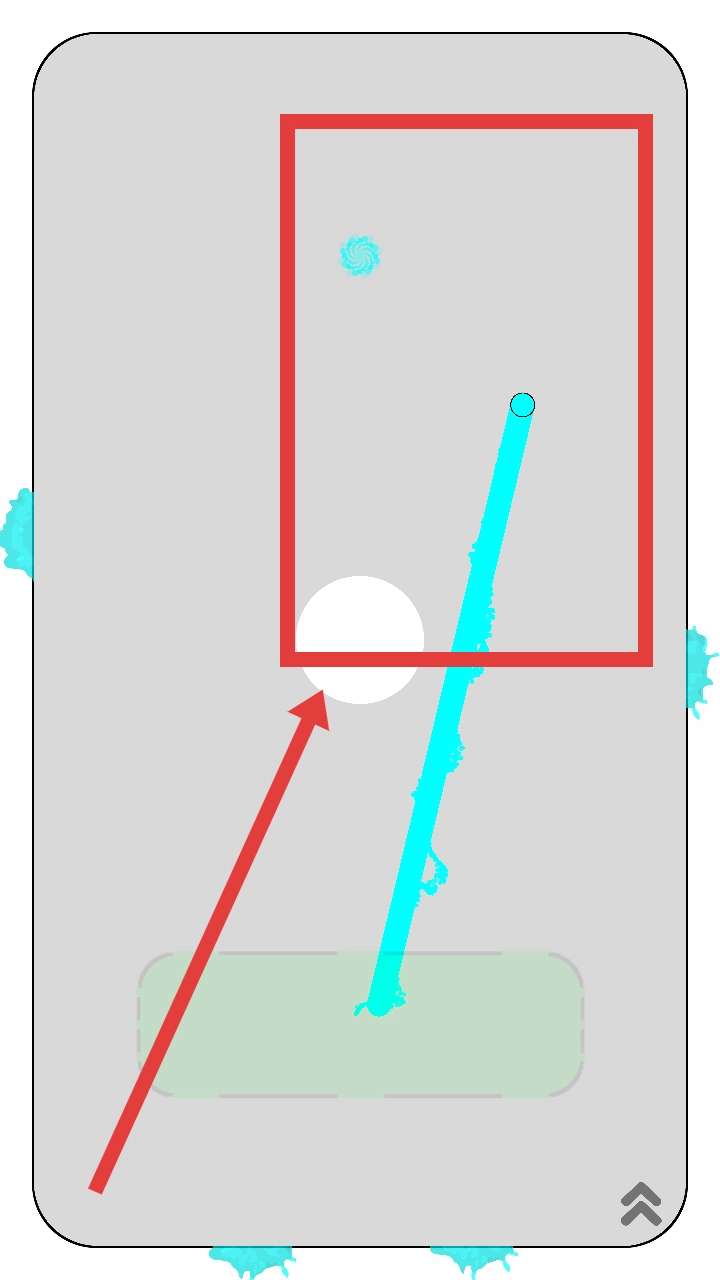 在出生区域,依照指引手指的指向,确定小球最初的发力位置,留意上方的目标所在,规划好小球的移动路线,引导小球朝着目标方向出发。