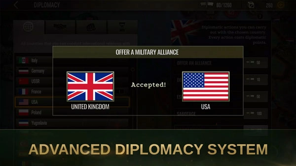 作为军事指挥官,你将率领一支由步兵、坦克、战斗机、轰炸机、战舰和大炮构成的军队投身战场;身为国家元首,你可以选择自己的国家并成为最高领导人,策略的制定完全由你决定:无论是任命将军、政治家还是作家担任要职,每位领导者都会带来其独特的加成,进而影响你的战略决策。