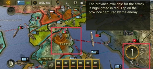 当板块边缘出现红色线条时,意味着当前区域可发起攻击。此时点击敌人占据的区域,周边军队便会前往支援作战地点。此外,在选定要攻击的敌军单位后,还需再次点击右下角的按钮以确认该作战指令。