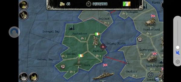 推荐破局策略:解除同盟关系,迅速夺取北爱尔兰;先招募一支消耗25点物资的步兵部队,再征召30物资的战斗机,用于掩护各区域的己方军队——战斗机不仅对海军轰炸和轰炸机具备极强防御力,还能对敌方空军造成反伤。随后伺机突袭爱丁堡兵工厂,可选择空降伞兵,也可等待英国调动海军暴露破绽;得手后立即用地面部队清除当地空军,以爱丁堡为据点向英国本土推进。站稳阵脚后,将爱尔兰的空军转移过来掩护步兵,最后以英国为基地继续推进游戏进程。