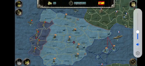 推荐破局策略:建立同盟关系,科学调配海军力量,对直布罗陀海峡周边的西班牙军队实施轰炸,完成海峡封锁;东部区域集中兵力突击意大利,西部则积蓄战力,联合法国共同歼灭西班牙军队。