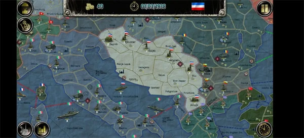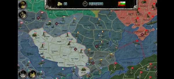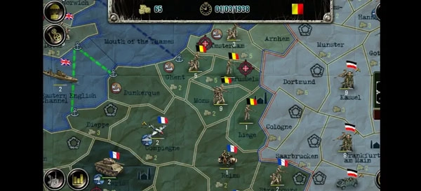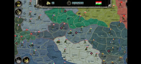 欧洲战场涉及28个国家与约500个地区,存在同盟国、轴心国、社会主义联盟三个阵营,另有个别中立国。(按我的理解)国家依据实力、科技水平及特殊事件划分为大、中、小三档:大国是阵营领袖,除某个以投降著称的国家外,阵营立场不会改变,且收入较高、初始兵力强劲,AI操控时可能触发傀儡政府事件,从而获得对小国军队与领土的控制权;中型国家在AI事件影响下可能变更阵营,初始兵力多为数百规模,科技发展程度不一;小型国家不仅可能改变阵营,还可能直接触发傀儡政府事件而改旗易帜,此外玩家操控小国时,初始兵力以志愿军为主,第一回合无法行动。接下来将分别对这些情况展开介绍。