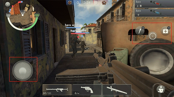 游戏开始后,左下角的摇杆用来操控角色移动,右侧则负责方向调整、射击、治疗等操作。