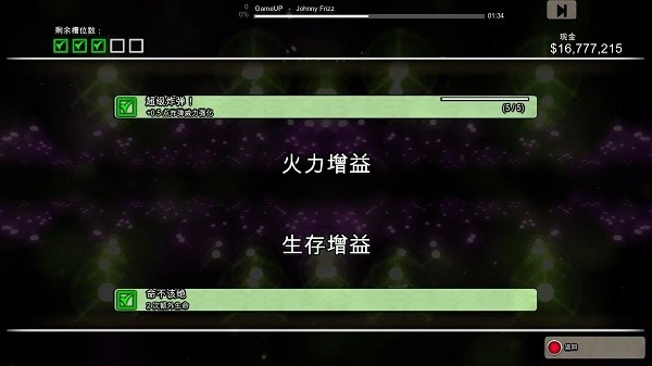 增益可分为其他增益、分数增益、火力增益、生存增益和难度增益这几类,并且最多能同时携带五种增益。