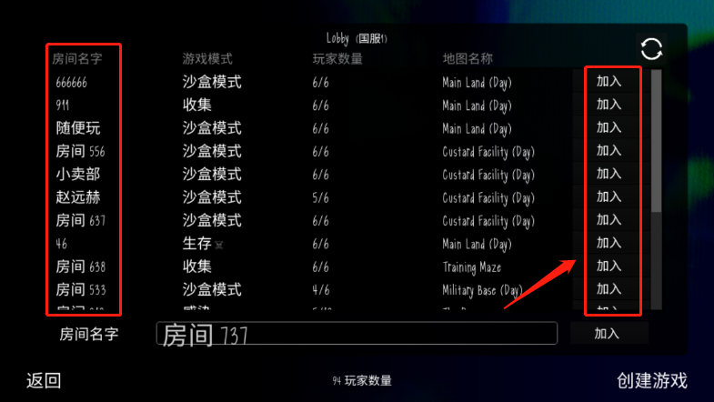 这里有不少房间,玩家可以挑选一个还没满人(或“人数未满”)的房间,点击右侧的【加入】按钮。