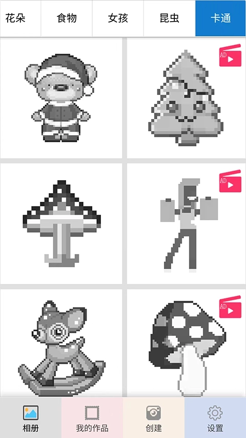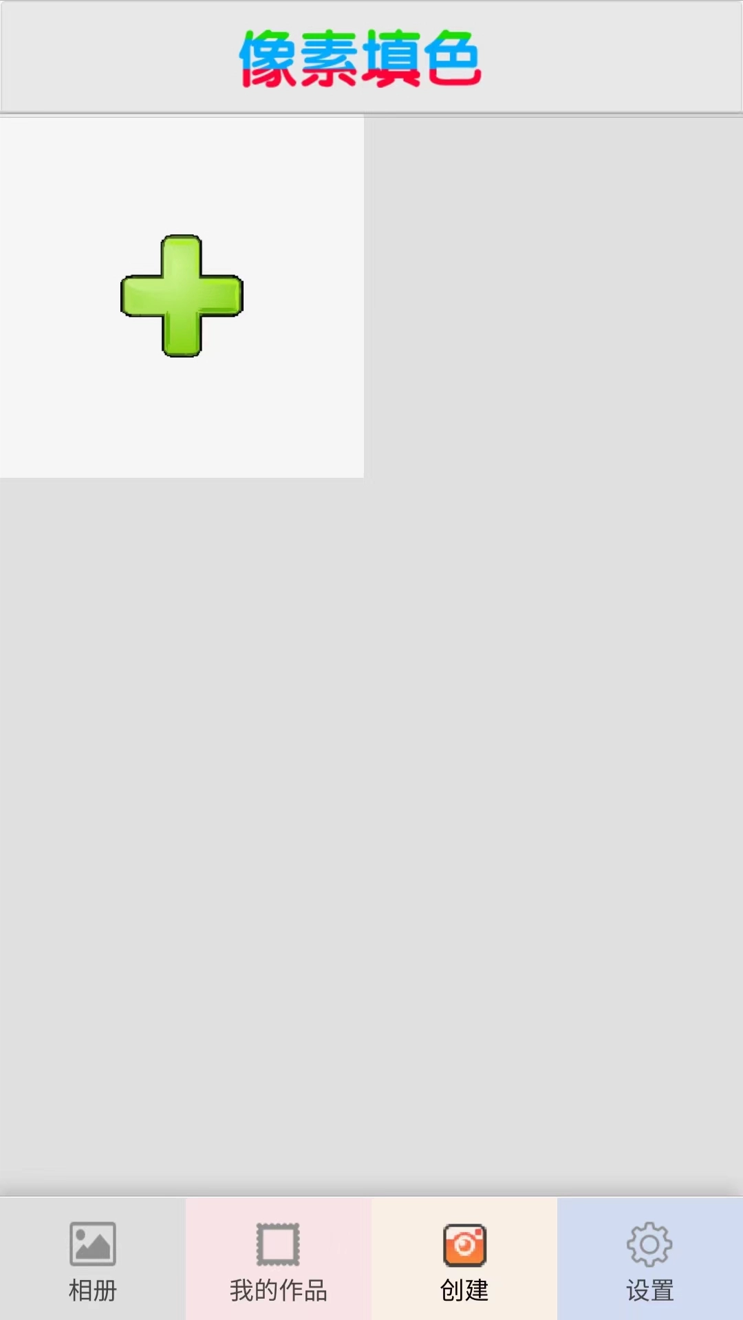 打开像素填色涂鸦大师安卓版后,能看到【相册】、【我的作品】、【创建】和【设置】这四个频道。