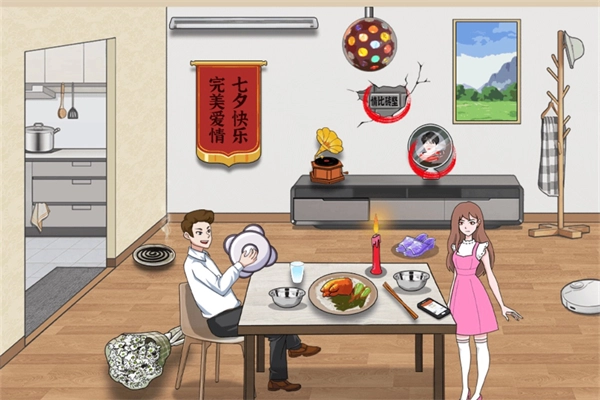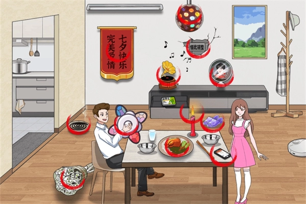 七夕这一关卡,需要点击墙面上的可点击锦旗,以及电视柜上的可点击音乐盒和灯光球。在地面上能够点击到正在燃烧的蚊香、一束鲜花以及一双紫色的拖鞋。