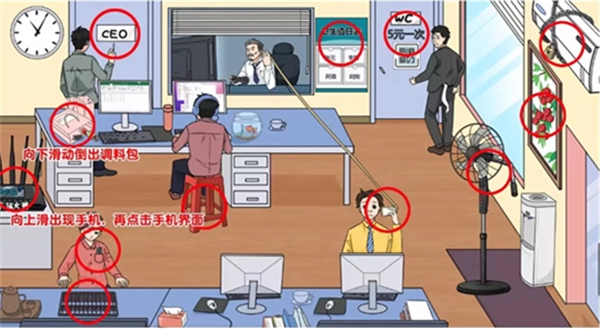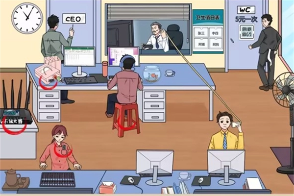 在画面右侧,玩家能发现上锁的空调、饮水机上的画、风扇,还有穿黄衣服的男人手中拿着的纸杯电话。