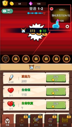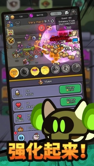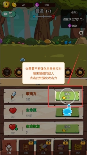 角色升级后会出现强化按钮,点击该按钮可将技能点分配至攻击属性,每次强化操作都能明显提高基础伤害数值与暴击概率。