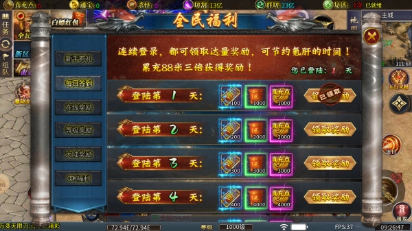 上线就能免费领取各类奖励,像在线奖励、每日签到奖励之类的,都能免费轻松获取。