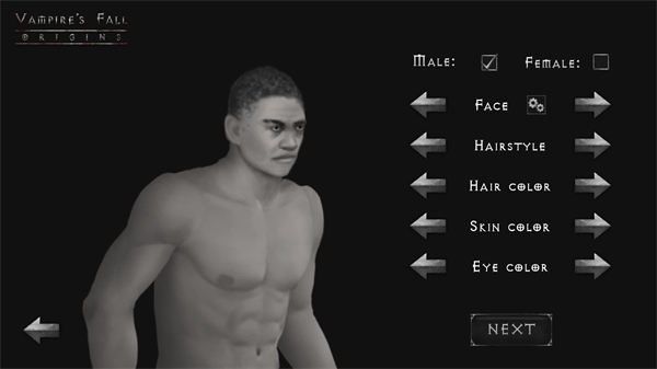 初次进入游戏时,需要对角色形象进行设置,你可以为自己的角色挑选发型、调整肤色和瞳孔颜色等,设置完成后点击NEXT按钮就能进入下一个环节。