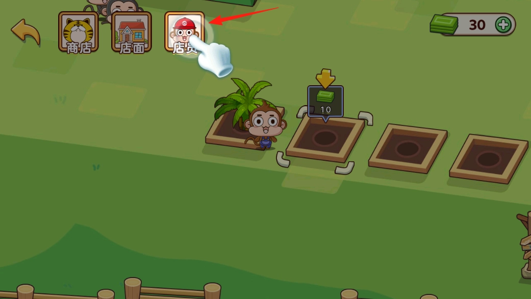 让店员猴子负责打理那四个种植坑吧,每株新植物的种植成本是10货币,右上角那30货币可得省着花。等植物成熟卖掉就能回本,慢慢攒钱就能把你的小店铺扩建起来了。